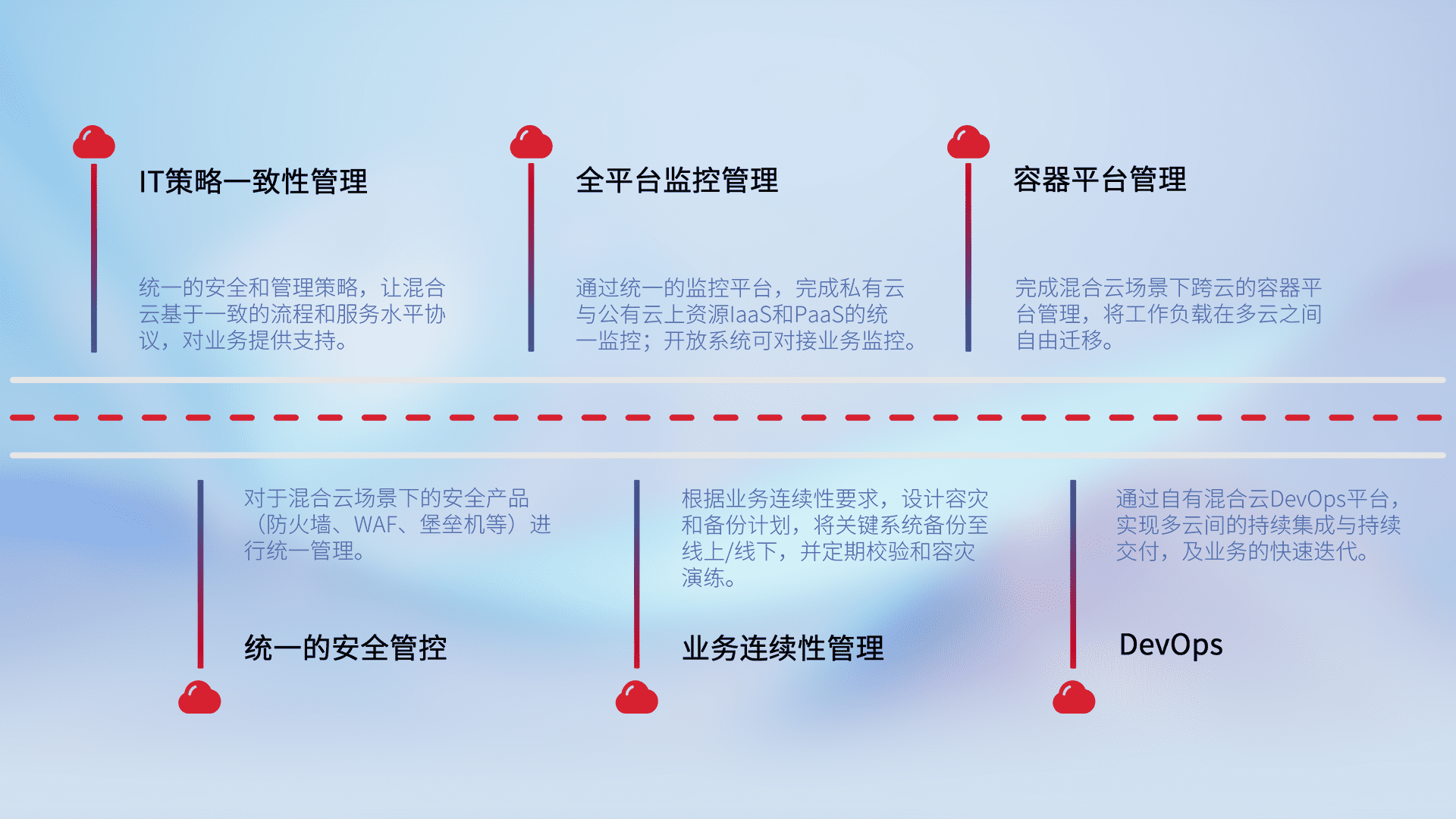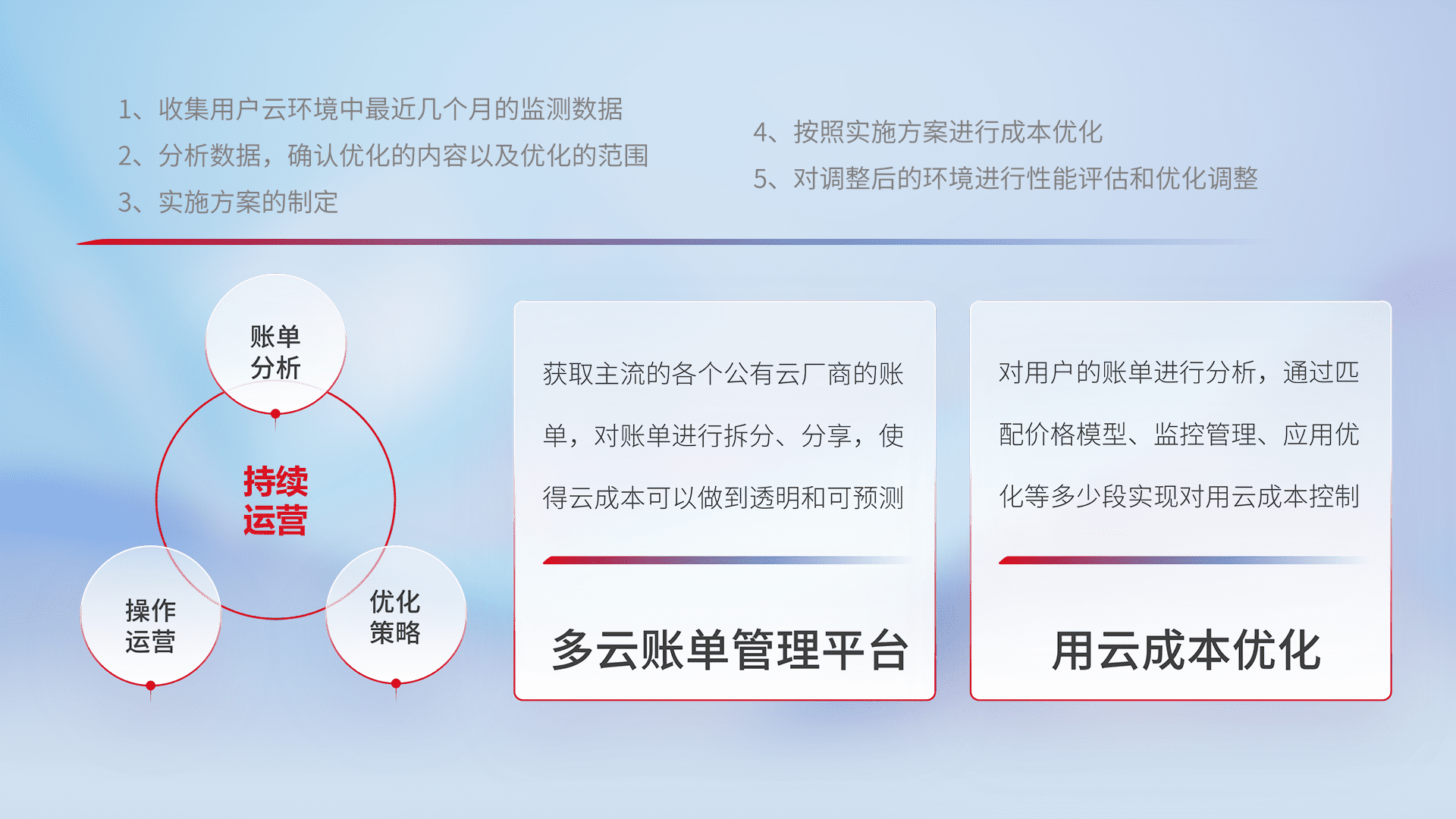 通过多云纳管,,,以统一的资源数据模型把客户的云资源进行抽象和封装,,,,进而实现对多云资源的统一操作,,,,保障云资源管理的可靠性、、、稳定性与可用性。。。。量身定制化运维内容,,,配置、、、开发运维、、、补丁管理、、、备份、、、、监控、、、认证和访问管理、、、、审计和日常巡检等,,,保障在用云过程中的可靠度,,,,稳定度以及高可用率。。。。